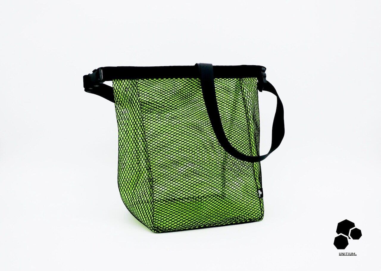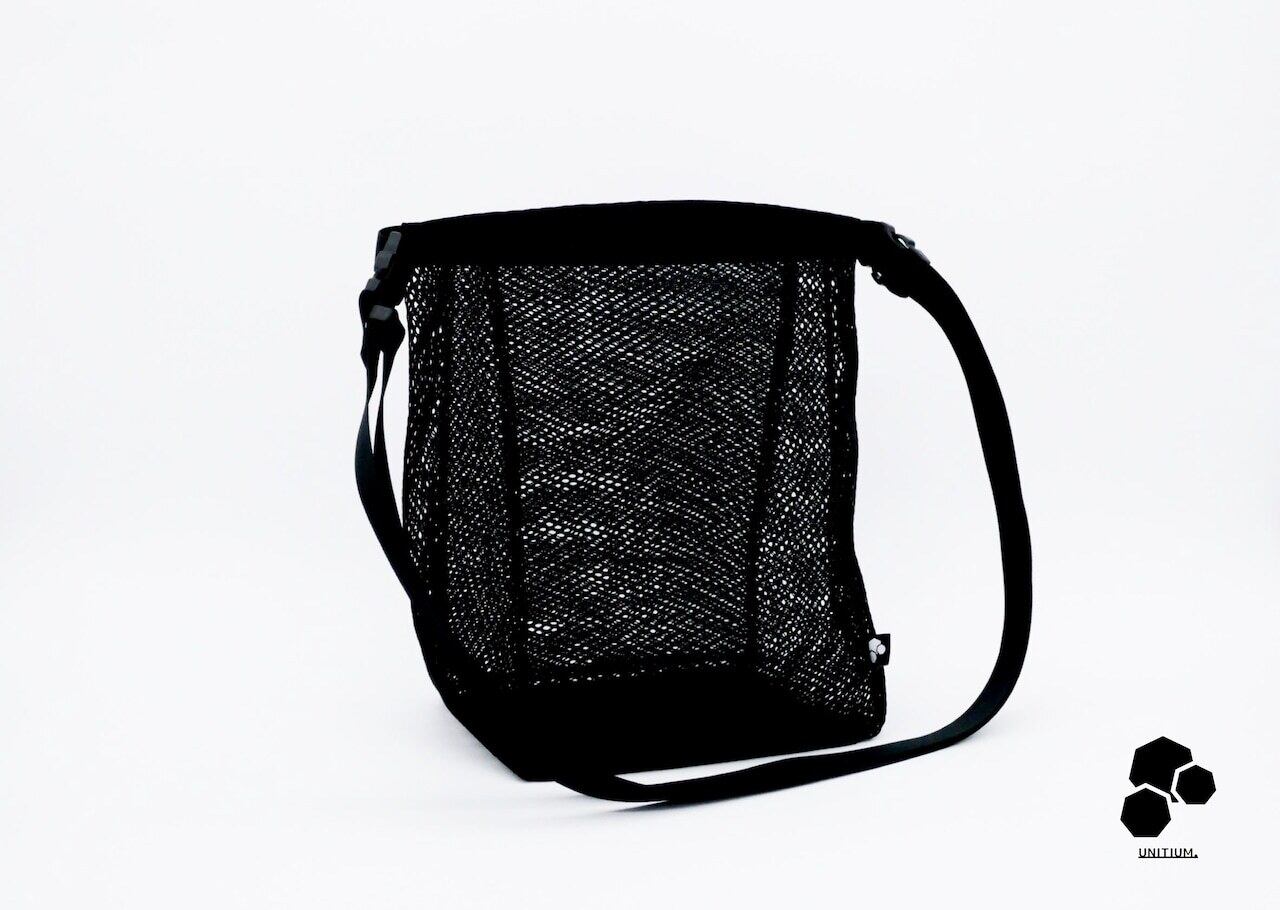 本来は粒子の細かいチョークを入れるものですが、UNITIUM.では「メッシュ」を重ね合わせた (Overlap) 独自の構造で、ライフスタイル で活躍するプロダクトにモディファイしました。ボトム部分にはVibram®を採用し、メッシュ素材ながら置き場所の状況を気にせずにご使用いただけます。