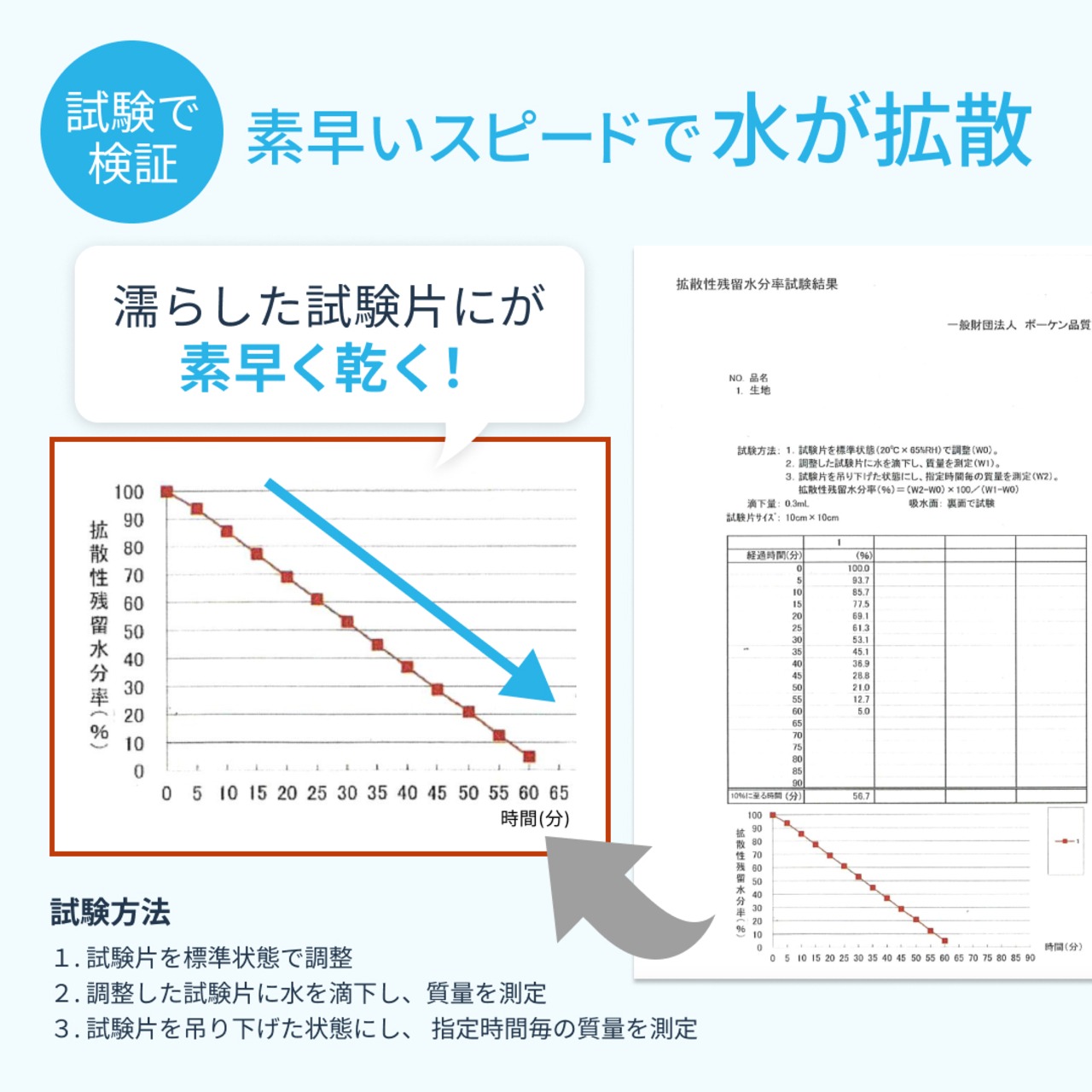 * 異形断面構造の繊維が、毛細血管現象により汗や水分を素早く吸収し、かつ素早く拡散、蒸発するときに気化熱を奪うことで冷涼感を得られます。