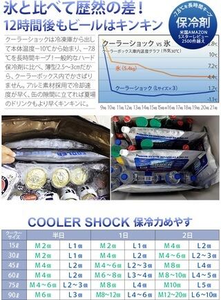 クーラーボックス内の保冷の表通り、クーラーショックは氷と比較した場合、同じ保冷力に必要とする量