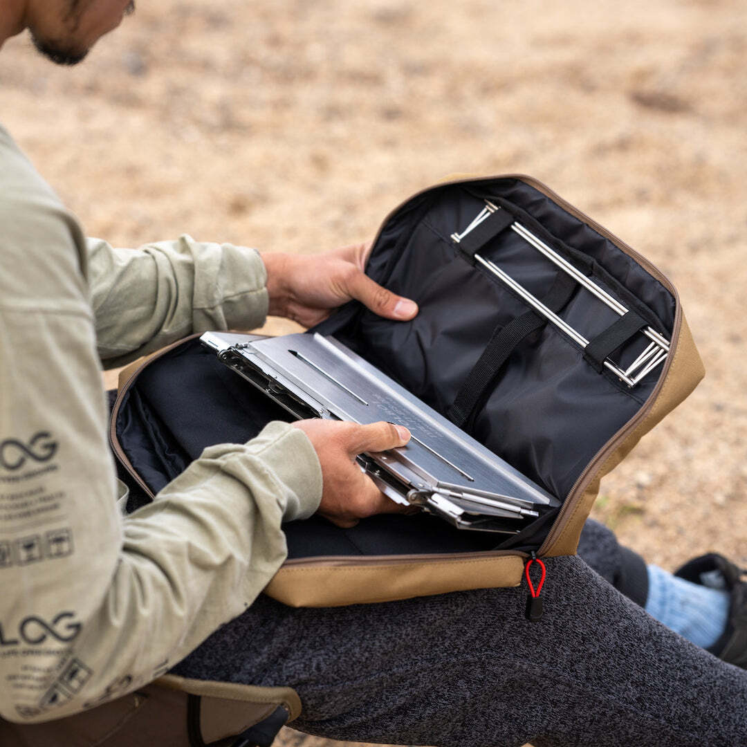 Bon Fire Stand(焚き火台)とFolding Tableをまとめて収納することができる、薄型のギアコンテナ。