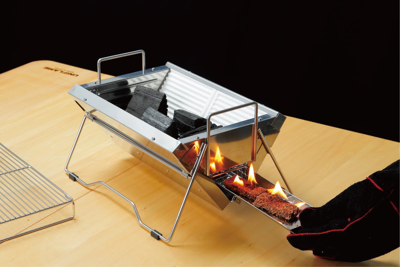 炭を入れて灰受けで着火材に着火して差し込むだけのラクラク着火。