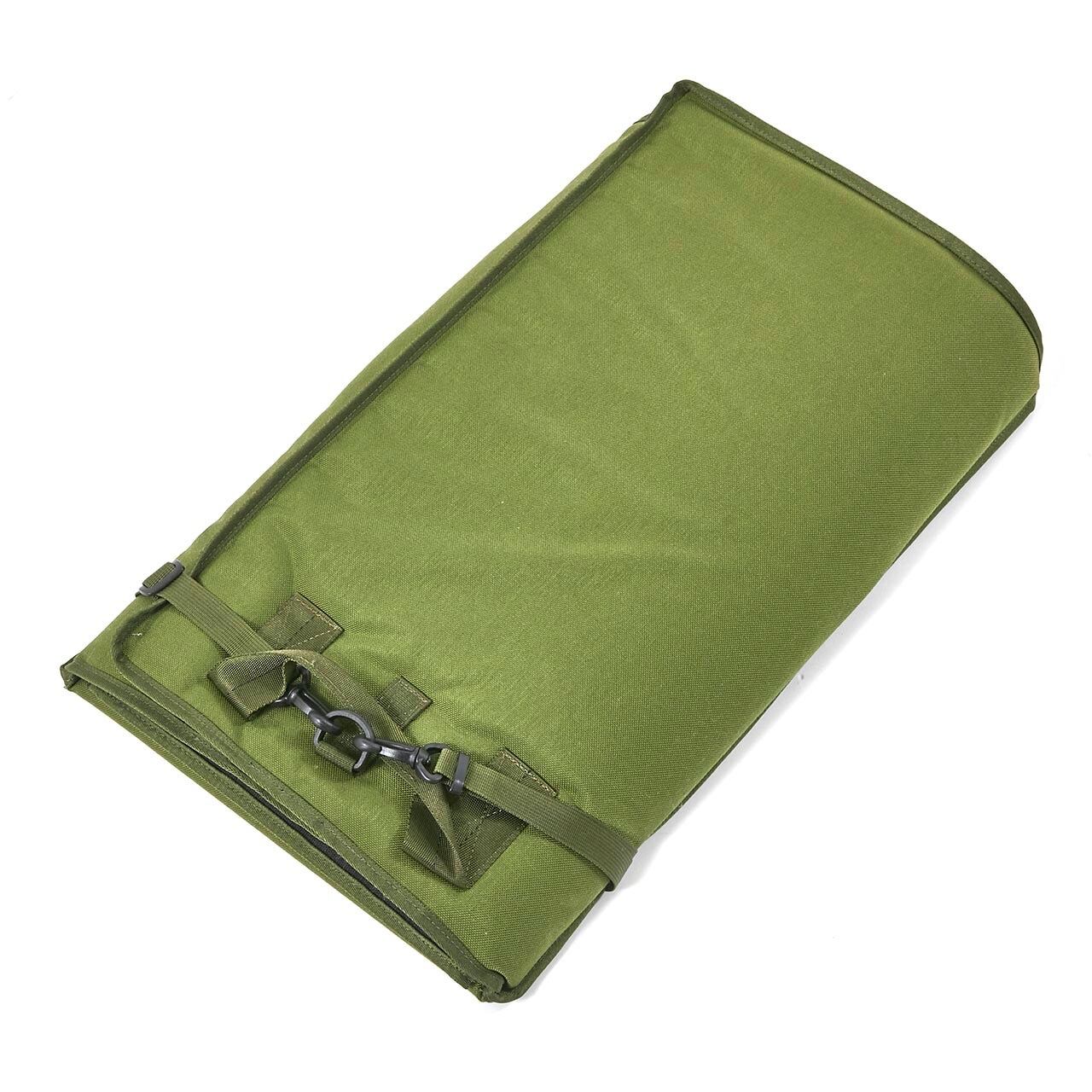 フロントの左右から底面に繋がるオープンファスナーを配置、底面センターに折れ線を設けましたので、前面から出し入れが出来る他、ファスナーを全開にして折りたたむと1パネルのサイズに平たくコンパクトに収納出来ます。長さ調節、脱着可能なストラップと車載時に持ち上げ易い大型ハンドルを左右に配置しました。
