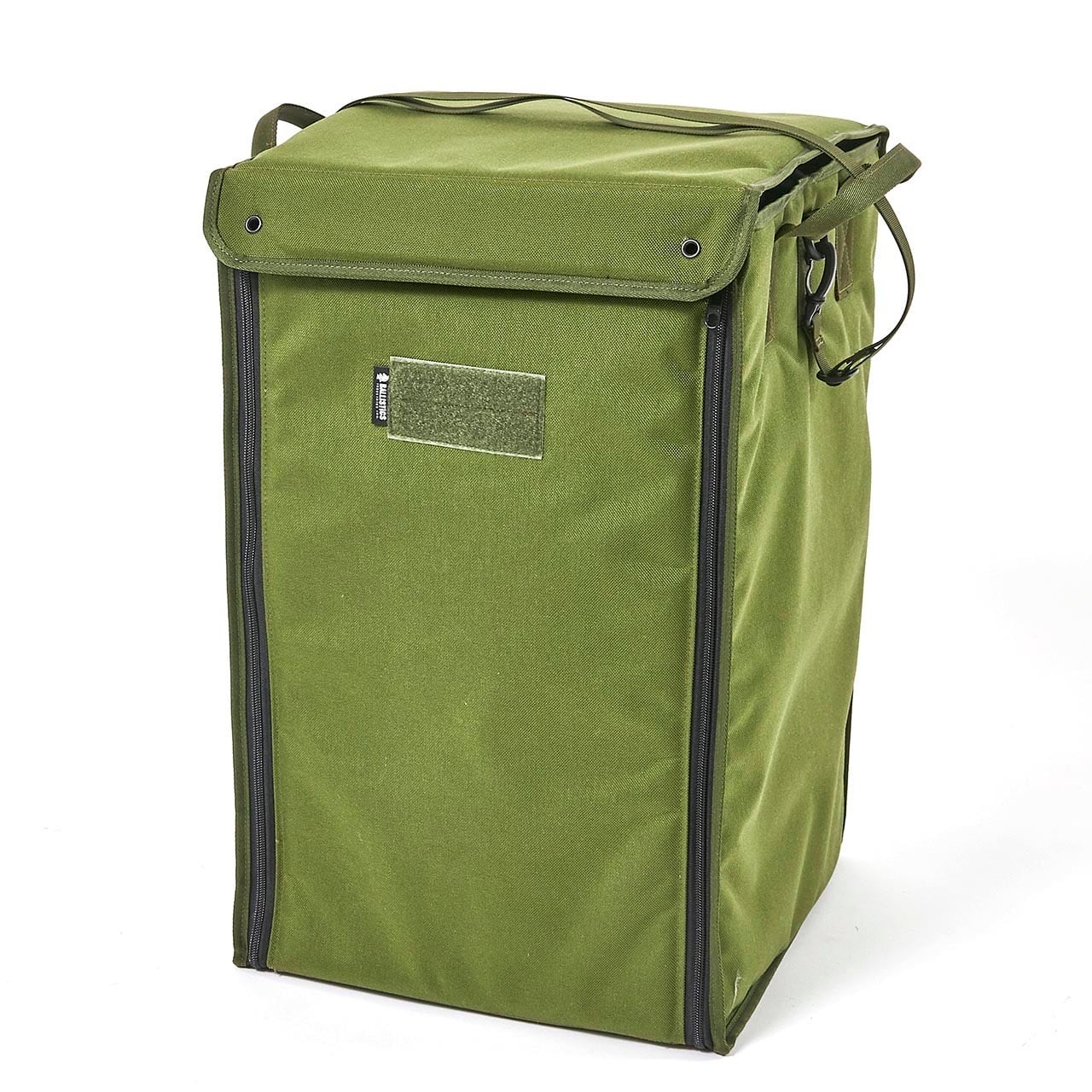 フロントの左右から底面に繋がるオープンファスナーを配置、底面センターに折れ線を設けましたので、前面から出し入れが出来る他、ファスナーを全開にして折りたたむと1パネルのサイズに平たくコンパクトに収納出来ます。長さ調節、脱着可能なストラップと車載時に持ち上げ易い大型ハンドルを左右に配置しました。