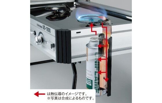 燃焼部分の熱をカセットボンベに伝えて温めることにより、液化ガスの気化を促進させ出力ダウンを防止する機構。