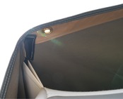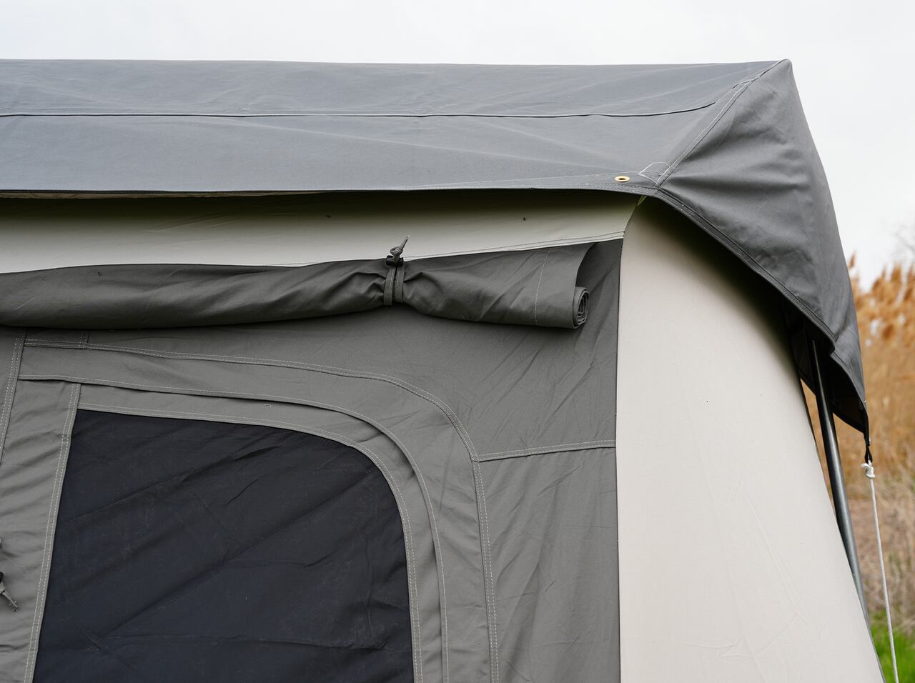 ①キャンバスカバートップをテント屋根の上に広げ、前面2箇所の裏側にある黒いマジックテープを、テント屋根両サイドの黒いロッドの余剰部分に巻き付けて固定します。