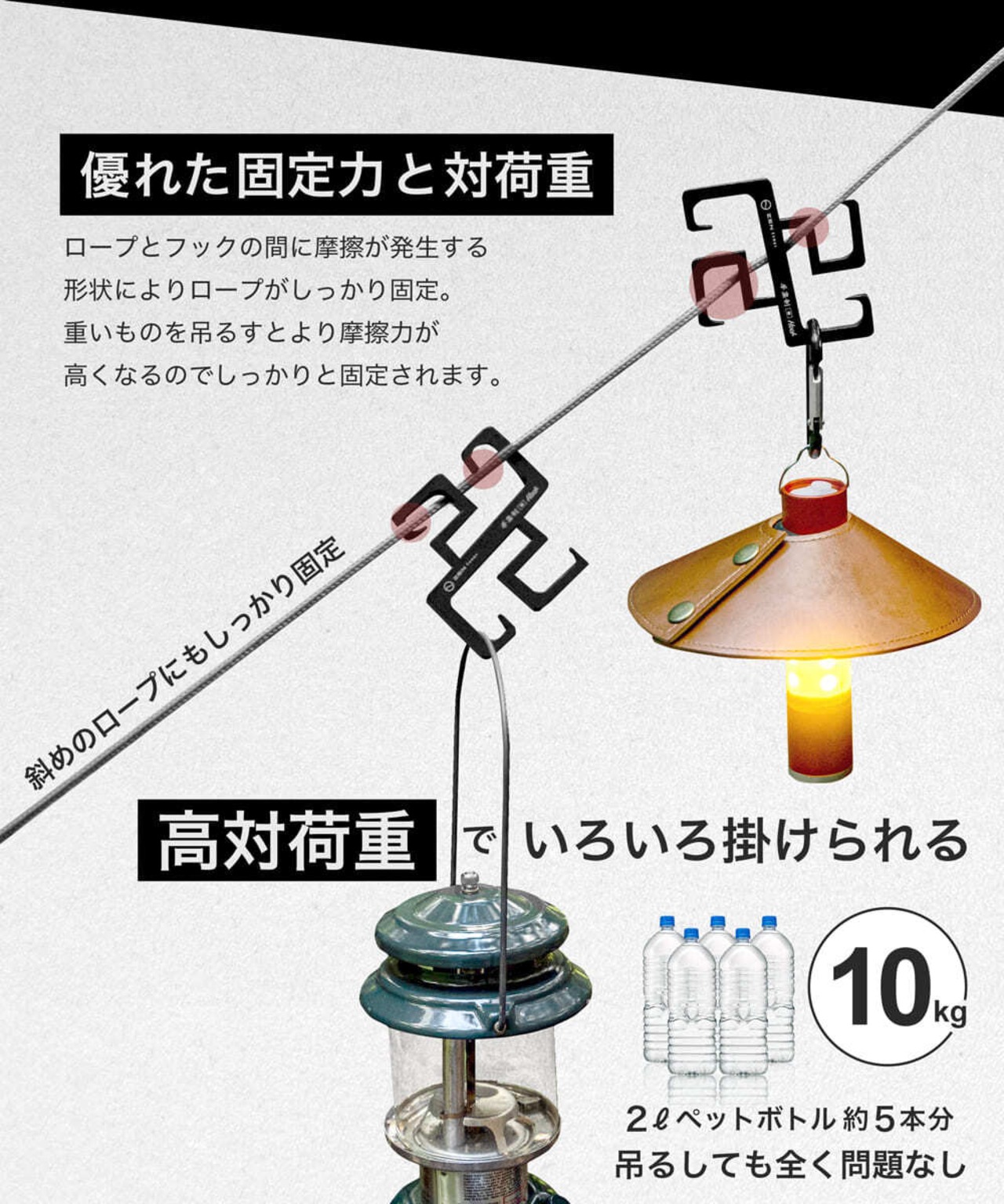 ・キャンプ用品を平置きせずに吊るすので汚れることもありません。またロープだけでなくて色々な場所にかけることができるので”空中に収納する”ことができるフックです。テーブルやラックを持っていくのは重たいのでミニマムなキャンプを目指すキャンパーにおすすめの商品です。