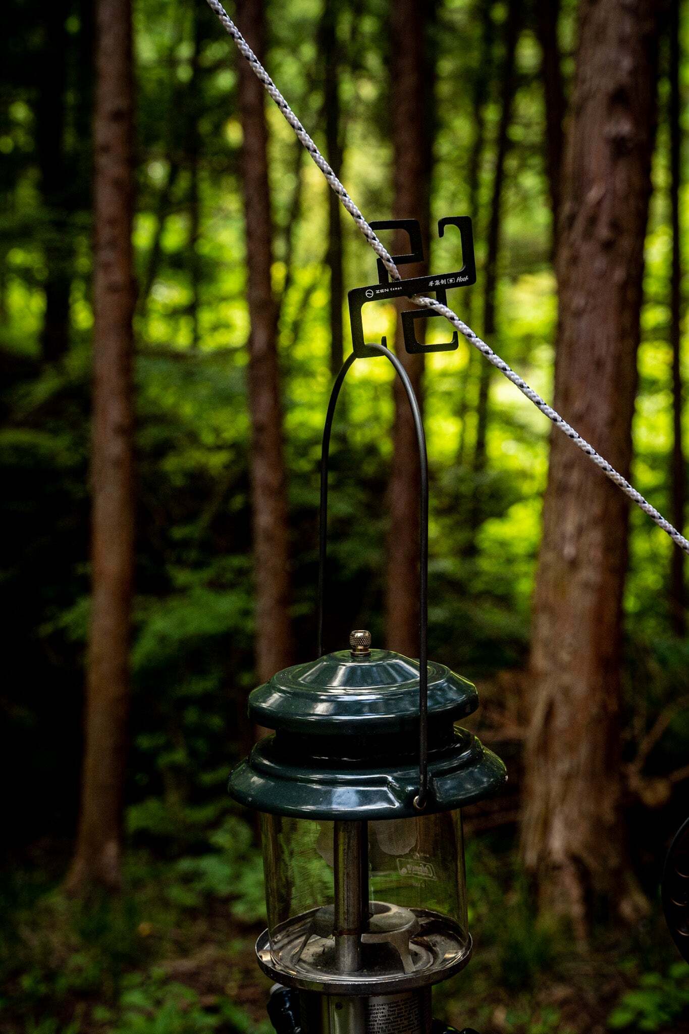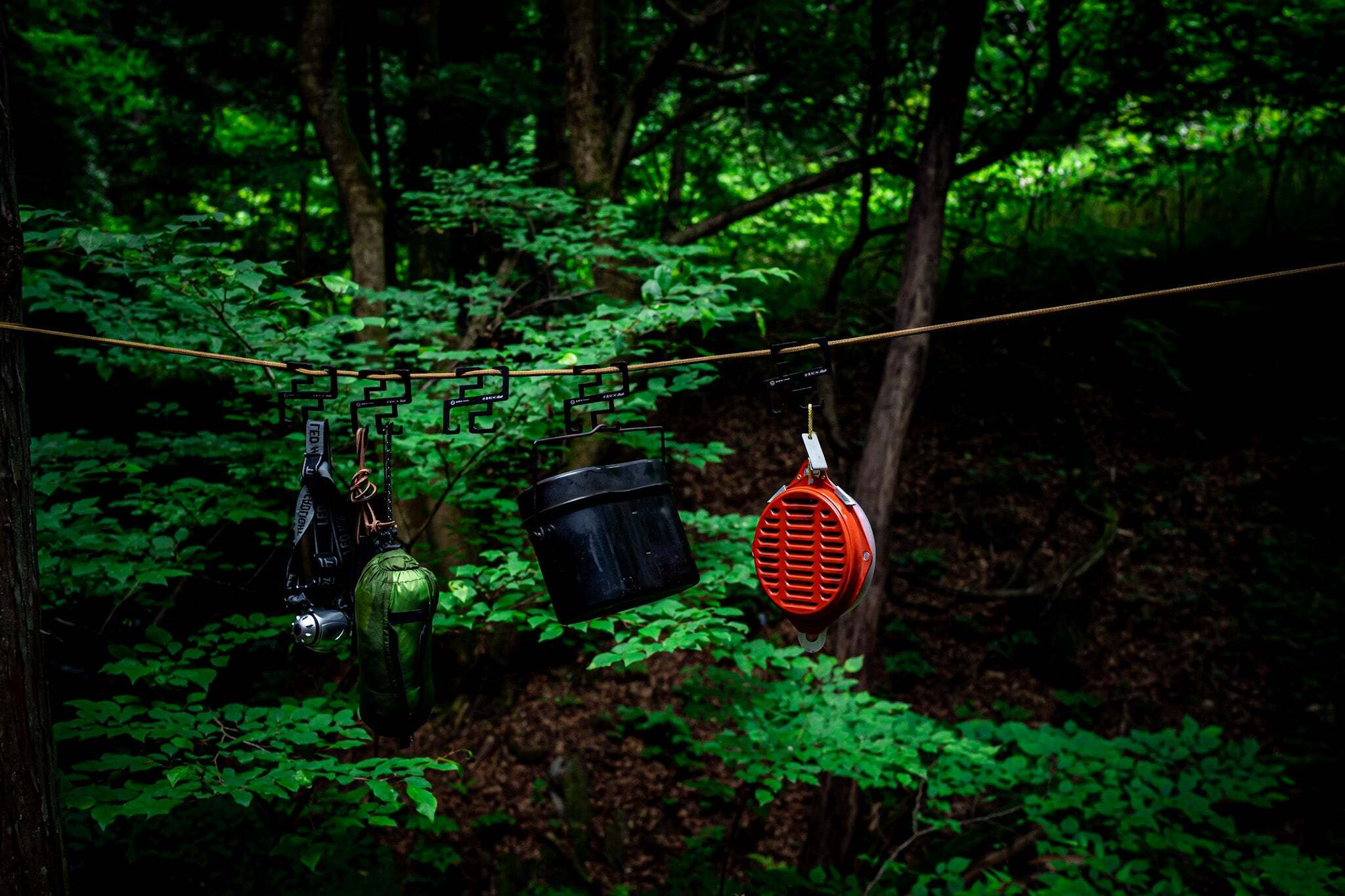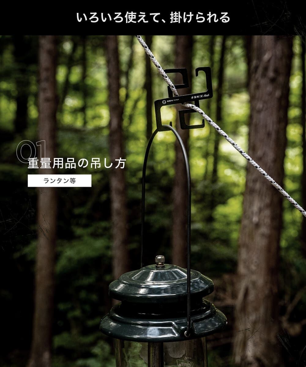 ・キャンプに行くと物の置き場に困ることがよくあります。テーブルやラックを出して、その上にものを置くのも良いのですが手間がかかったりスペース取ったりします。テントやタープを設営するときにガイラインは必ず使うので、そのロープに手裏剣フックを固定してものを吊るすことでロープを有効活用できます。