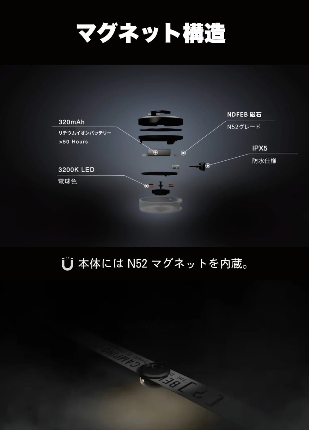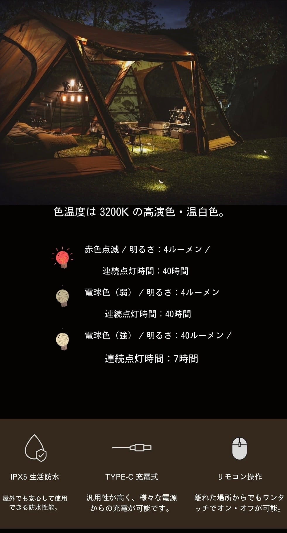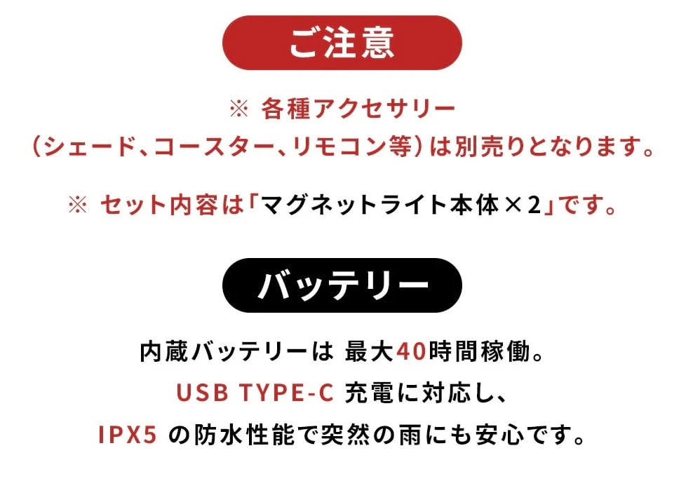 IPX5防水 × 最大40時間点灯。