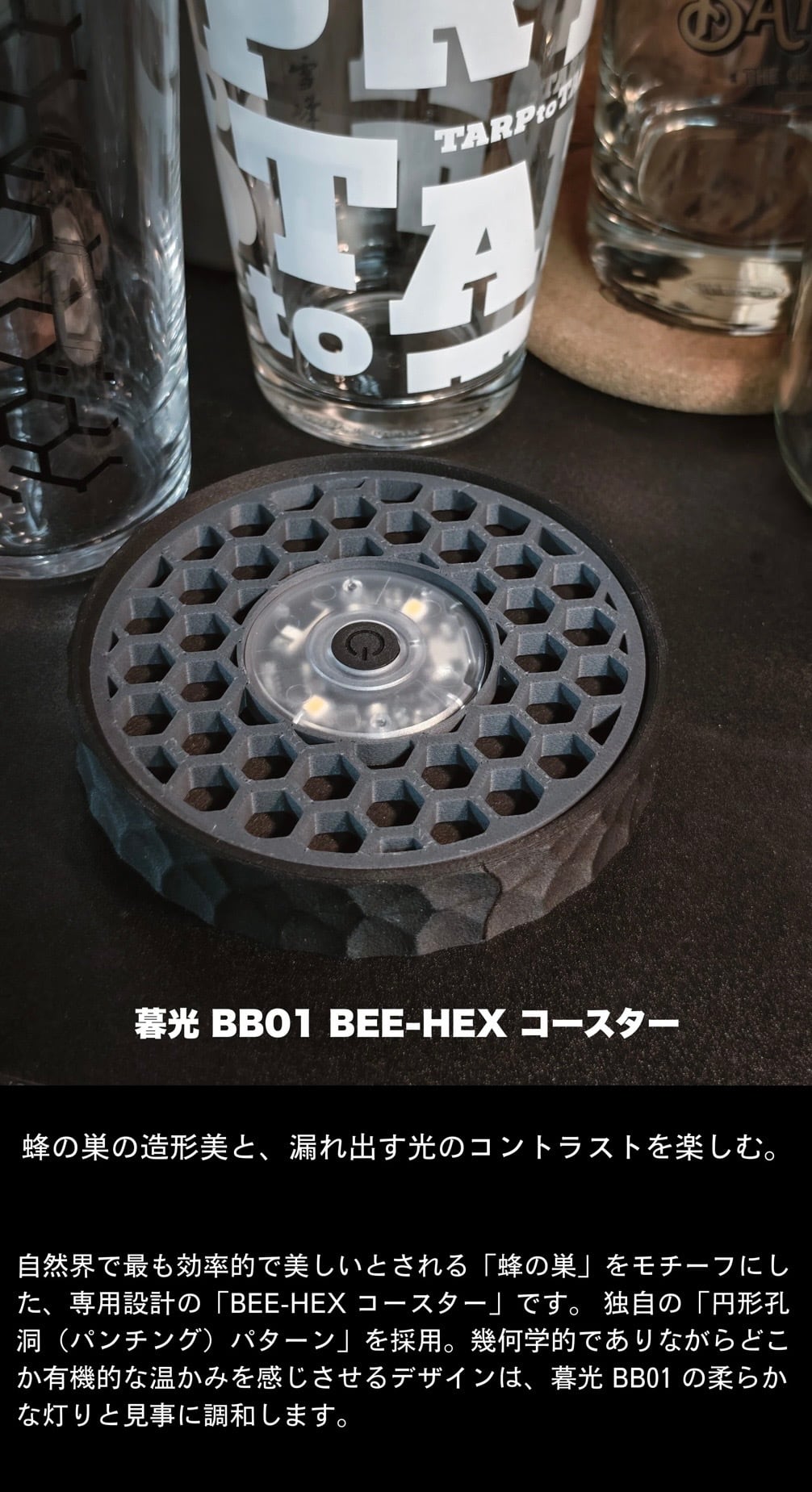 自然界で最も効率的で美しいとされる「蜂の巣」をモチーフにした、専用設計の「BEE-HEX コースター」です。独自の「円形孔