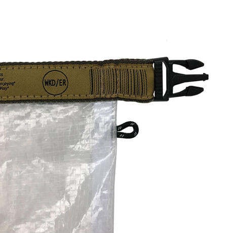 中が見えるロールトップ式の収納ケース。 中に収納したら面ファスナーを留めて、口元をくるくると巻き、バックルを留めます。