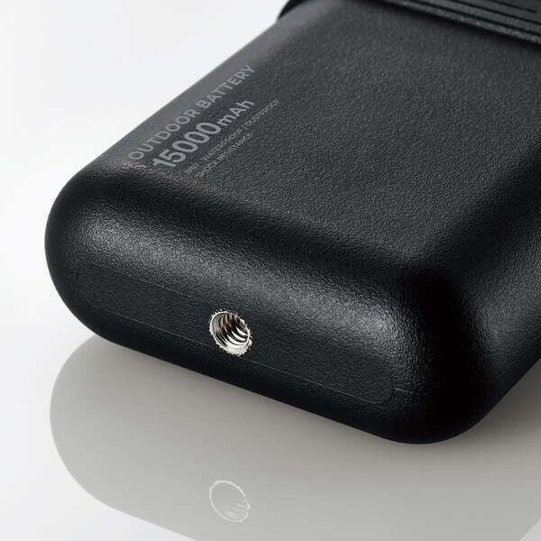 アウトドアシーンに最適な防水・防塵・耐衝撃のモバイルバッテリー。リチウムイオン電池を衝撃や振動から守るクッション構造とJIS保護等級IP67相当の防水防塵性能で、屋外での落下や水濡れからバッテリーを守ります。別売りのパーツを取り付けると、LEDランタンなどのアウトドアギアとして使えるアウトドア特化型モデルです。