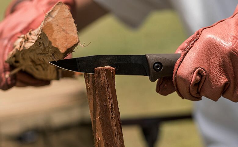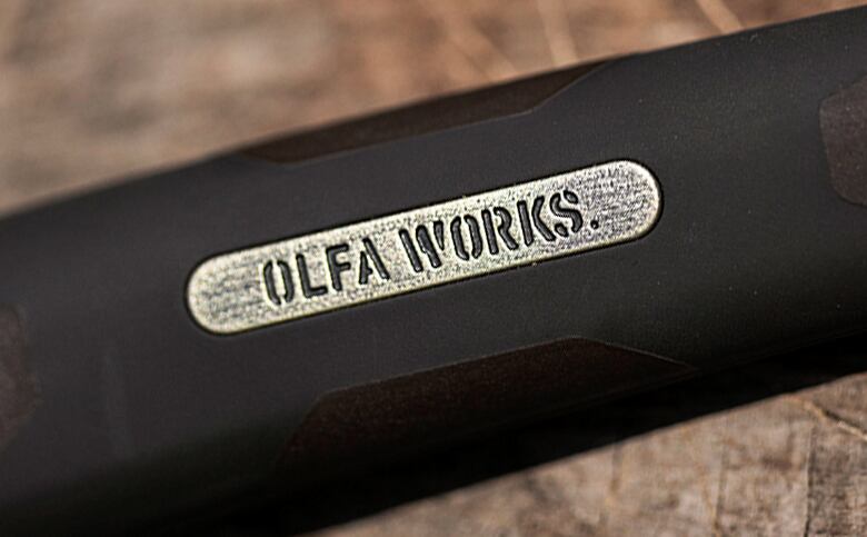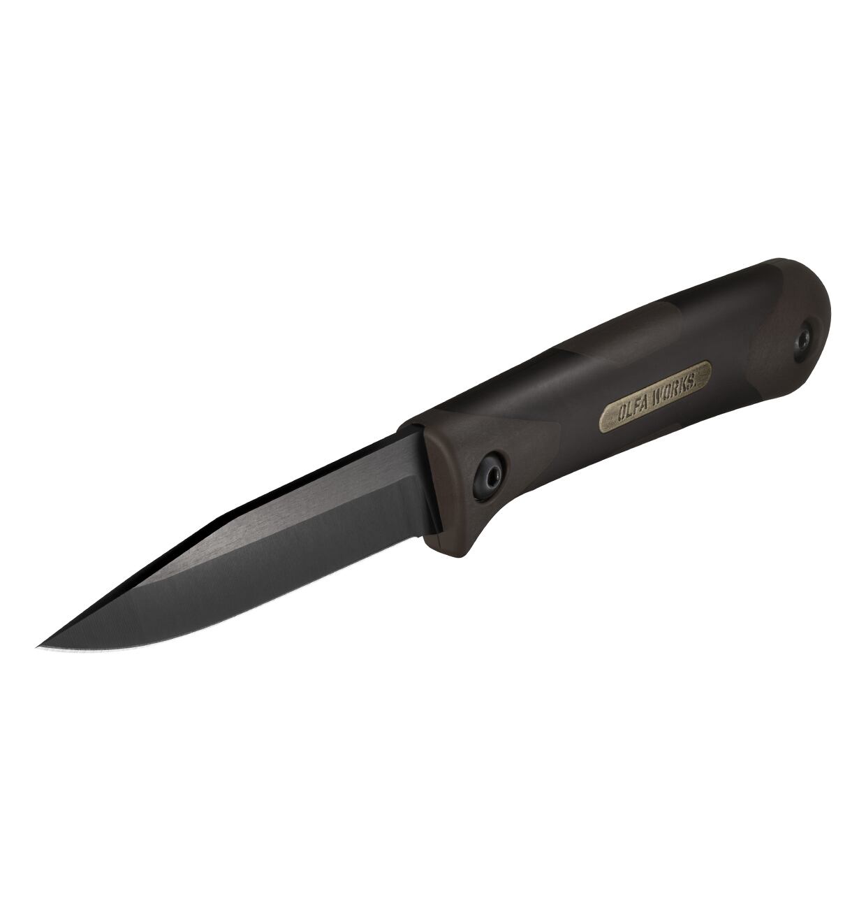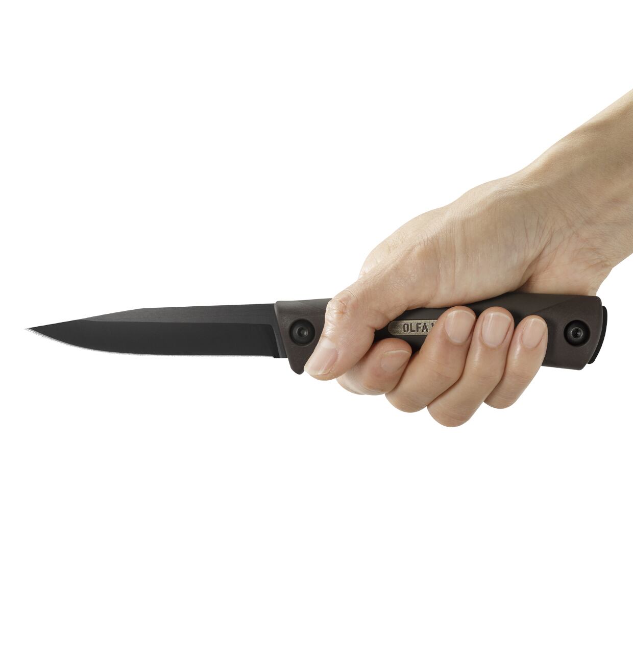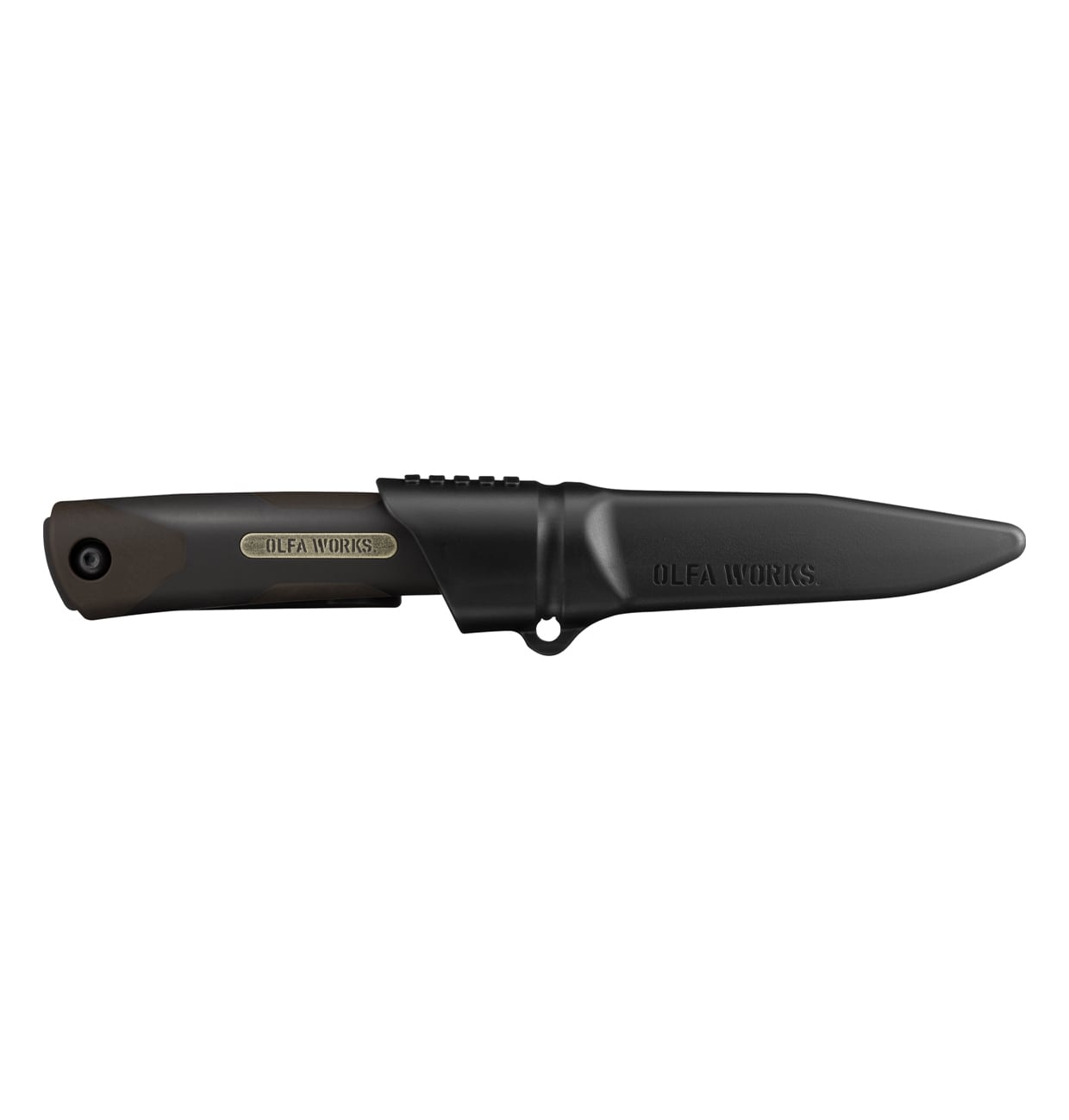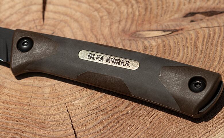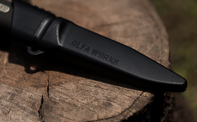 3.2mm 厚のステンレス刃を装着したフルタングナイフ。切る・削るはもちろん、バトニングも可能。職人が1 本1 本丁寧に研ぎあげた刃とオルファの知識・経験をいかした設計は、切れ味・耐久性・使いやすさに優れています。シース付き。刃とグリップはアウトドアショップ「Orange」監修の特別仕様。
