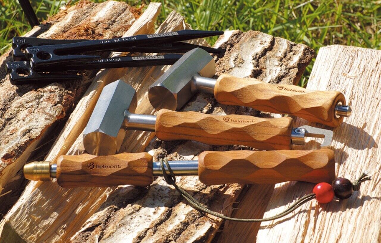 これ一本で設営から撤収まで活躍します。木柄は握りやすい名栗加工のグリップで、硬い土へもペグの打ち込みが楽々できます。
